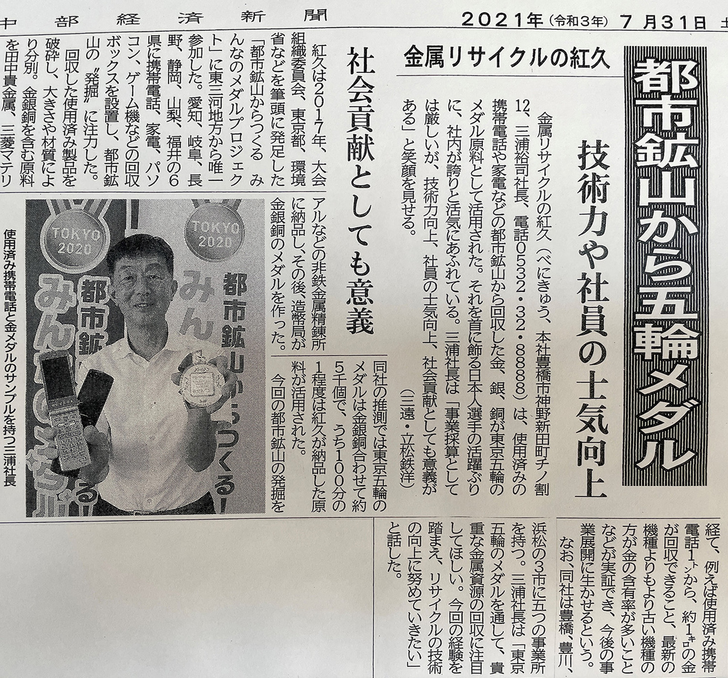 紅久は「東京2020組織委員会」「東京都」「環境省」「一般財団法人 日本環境衛生センター」などの下で、2017年4月より発足した、「都市鉱山からつくる!みんなのメダルプロジェクト」のメンバーとして東京五輪の金銀銅メダルの原料を都市鉱山から回収し供給する事業を2019年3月にかけて実施しました。